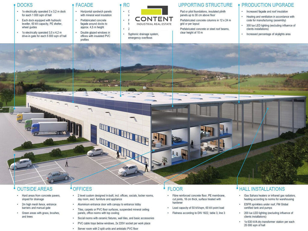 V zastoupení majitele a bez provize nabízíme samostatné industriální prostory o velikosti 9600 m², vhodné pro sklad nebo výrobu, umístěné v novém komerčním parku přímo u dálnice D6, EXIT 7.