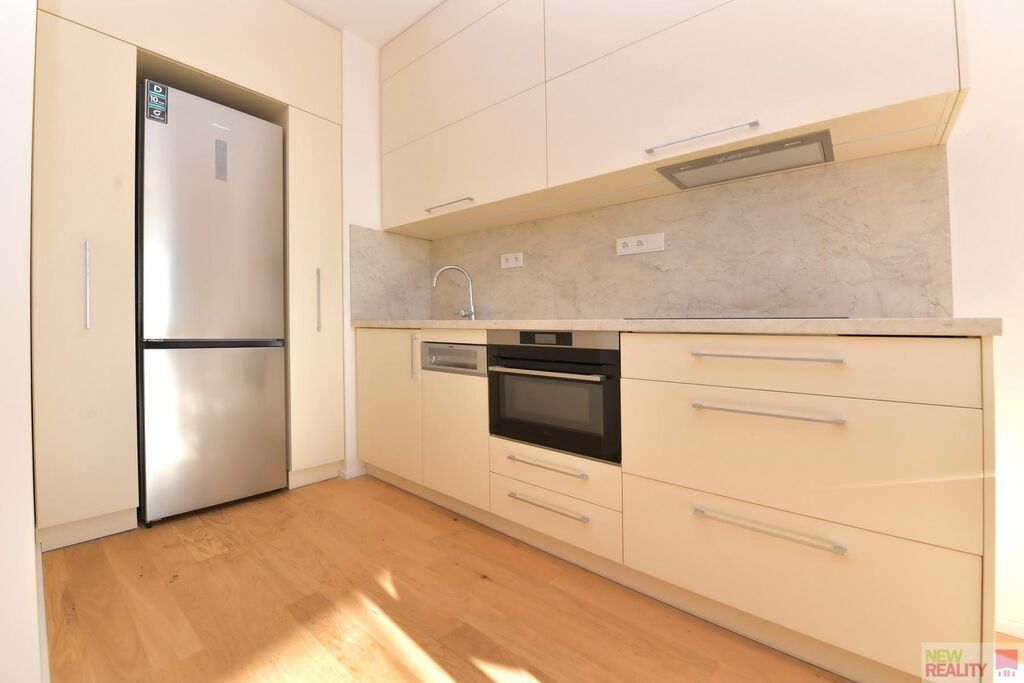 Kuchyň je osazena kvalitními vestavnými spotřebiči lednicí, troubou, myčkou, varnou deskou a digestoří. K dispozici jídelní stůl a židle. V obývací části je rozkládací sedačka v šedém tónu. Předsíň je elegantně zařízena botníkovou lavicí, věšákem a skříňkou pro odkládání oděvů. V bytě dominují světlé přírodní tóny, dřevěné podlahy a dlažba v koupelně a předsíni. Vše je zcela nové, nepoužité a pečlivě sladěné do moderního stylu.