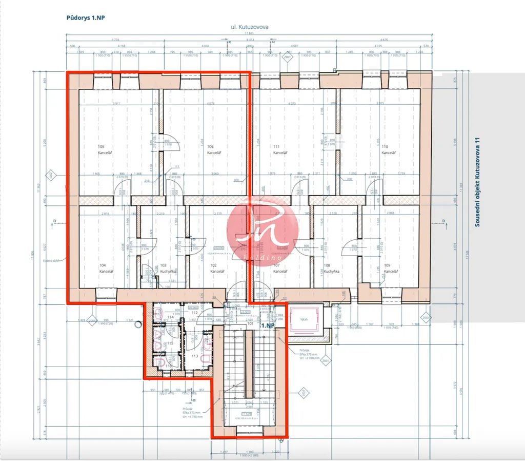 4 prostorné kanceláře, kuchyňka, WC na chodbě – celkově 78,05 m²