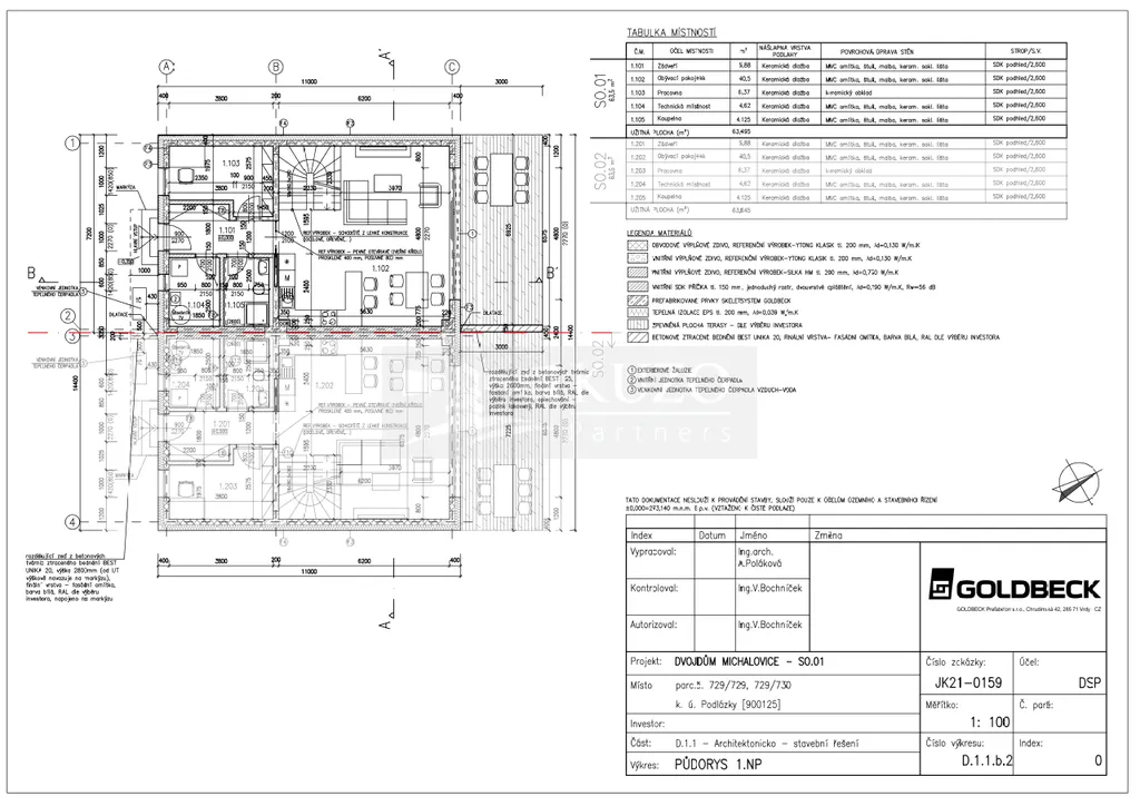 Dům je postaven z kvalitních materiálů – nosnou konstrukci tvoří železobetonový prefabrikovaný systém doplněný o zdivo z pórobetonových tvárnic. Střecha je plochá, zateplená, s tepelnou izolací z EPS. Okna jsou plastová s trojskly v elegantním antracitovém provedení s dubovými parapety z masivu, která podtrhují moderní vzhled domu. Fasáda je obložena páskovými cihlami v odstínech Dover a Ibiza, díky čemuž působí nadčasově a přirozeně zapadá do okolní zástavby.
