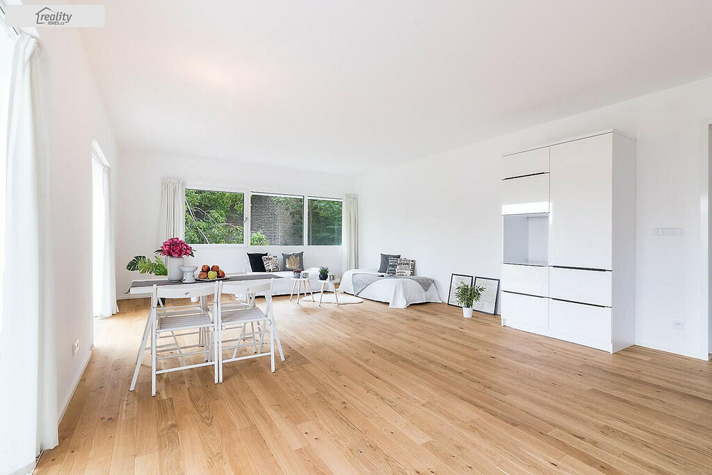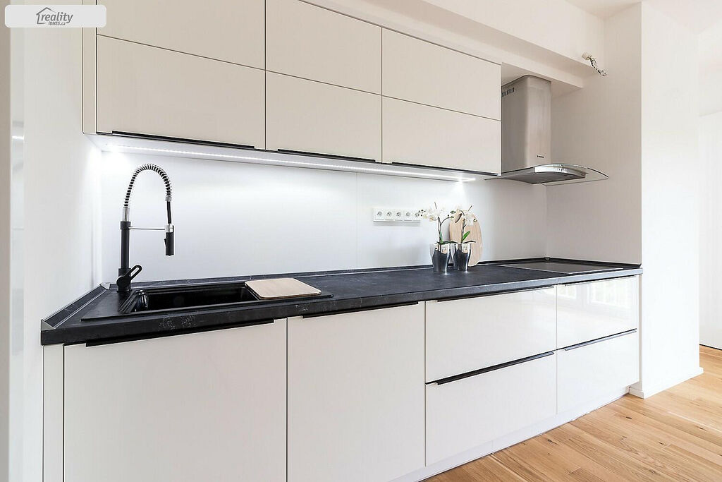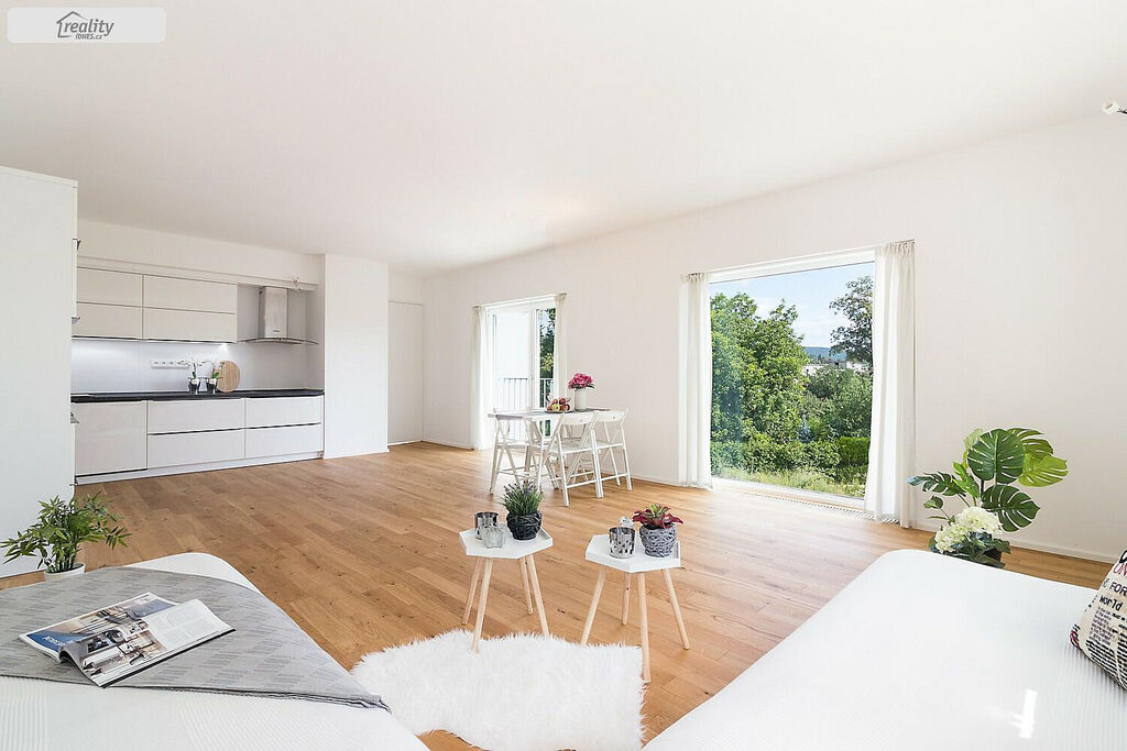 Pronájem nadstandartního 3+kk s možností řešení jako 4+kk, 98 m²,  v novém projektu Corso Pod Lipami v Řevnicích. Byt je částečně zařízený, dvě koupelny, garáž a sklep.