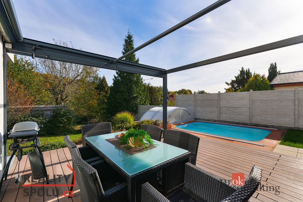 • Terasa s elektricky ovládanou pergolou poskytuje pohodlné posezení ve stínu.
