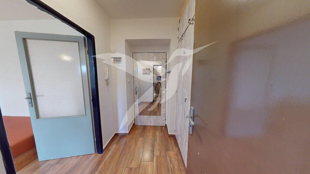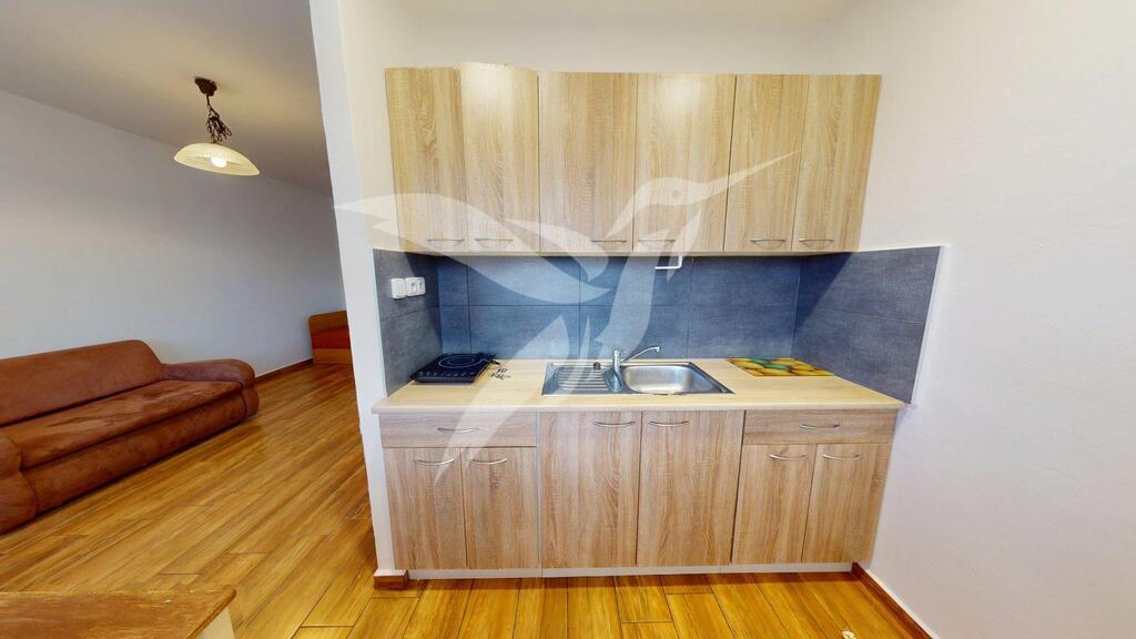 Byt o velikosti 27 m2 se nachází v 5. NP panelového domu s výtahem a skládá se z předsíně, průchozího pokoje, pokoje včetně kuchyňské linky a koupelny s toaletou. Součásti vybavení je kuchyňská linka s vařičem, kombinovanou chladničkou a MW troubou, dále jídelní set, sedačka, postel, skříň na úložný prostor. Vytápění a ohřev vody je zajištěn dálkovými dodávkami.