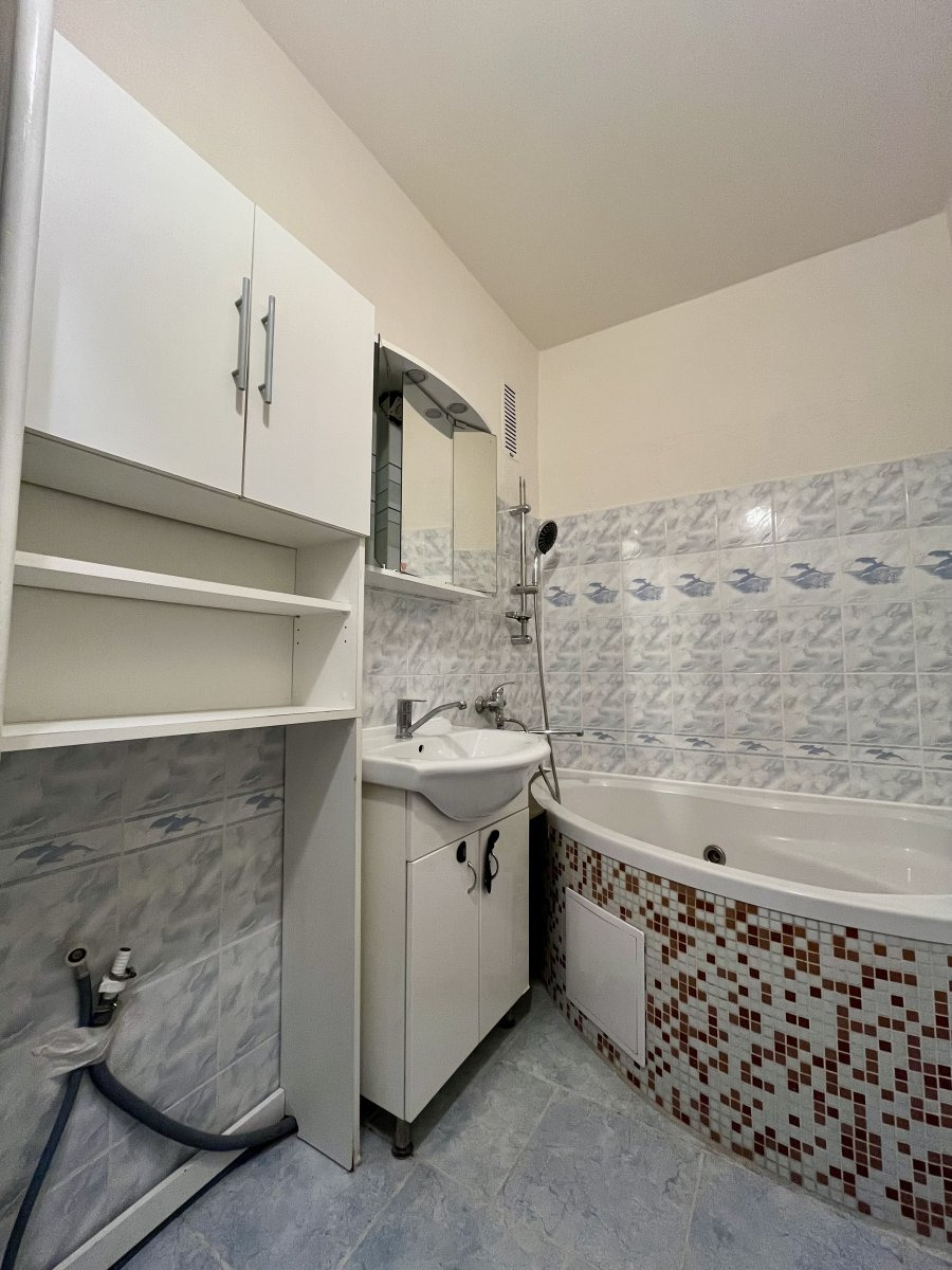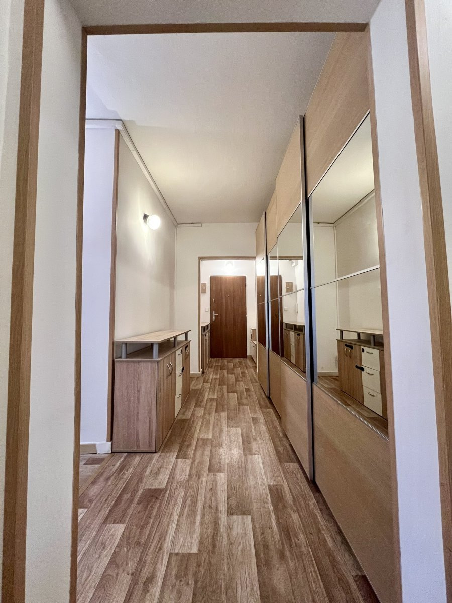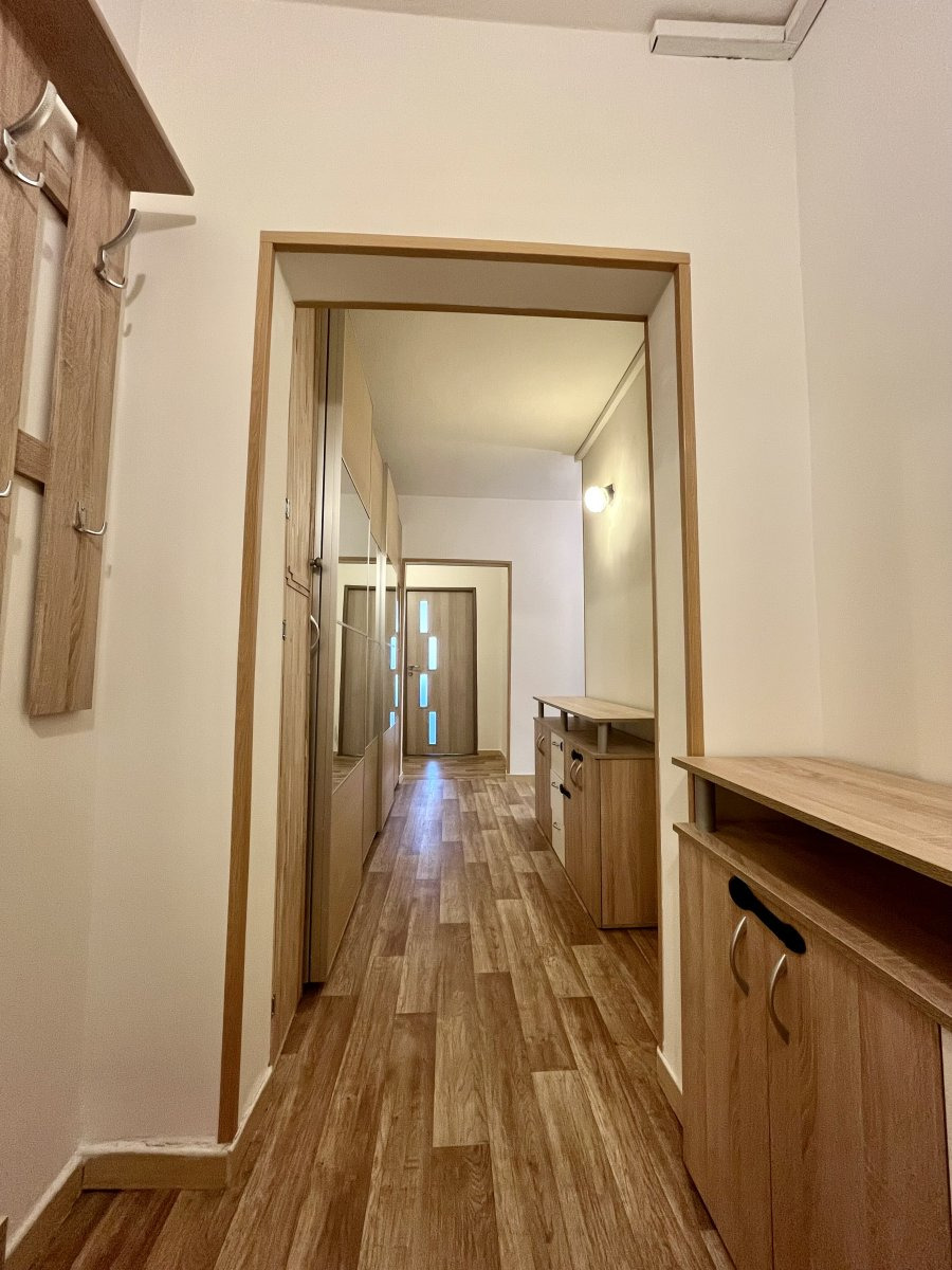Byt je částečně vybavený a má skvělou dispozici – z prostorné předsíně s vestavěnými skříněmi se vchází do všech místností: