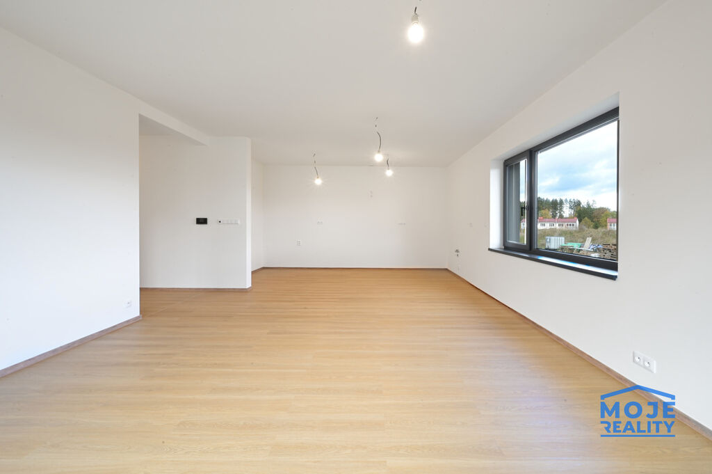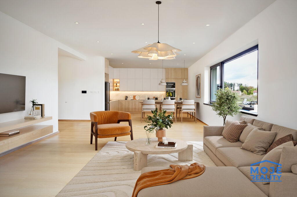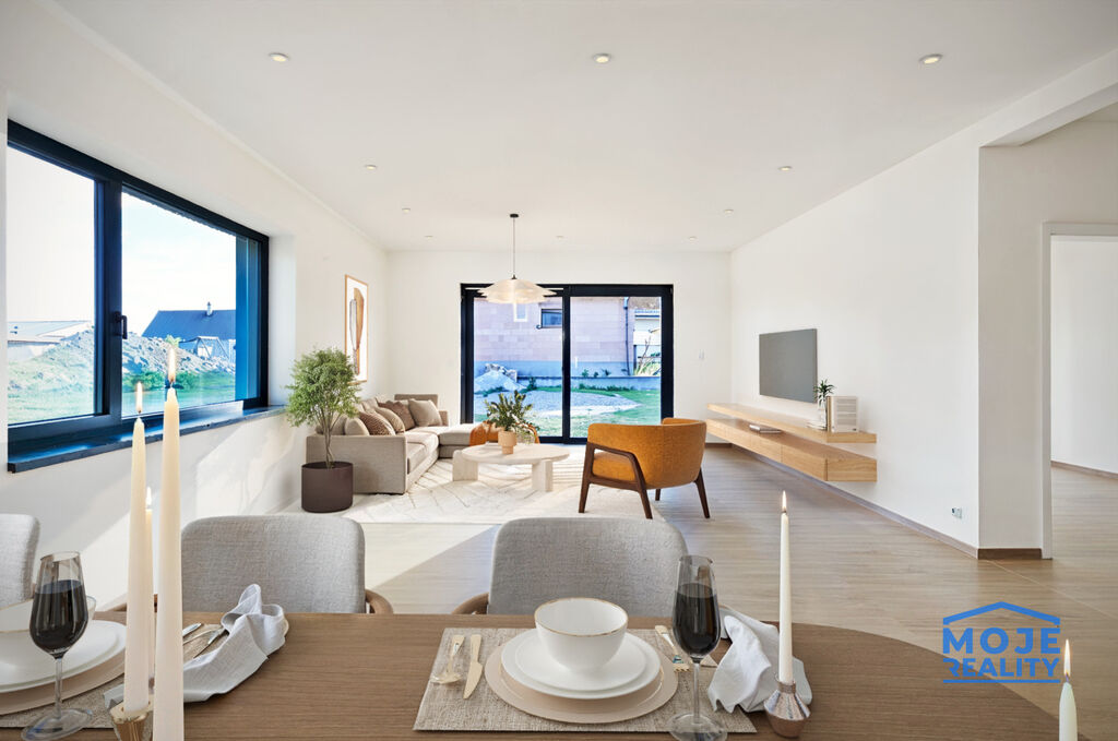 Nabízíme k prodeji novostavbu komfortního rodinného domu o dispozici 4+kk s garáží a prostornou zahradou o výměře 1080 m².