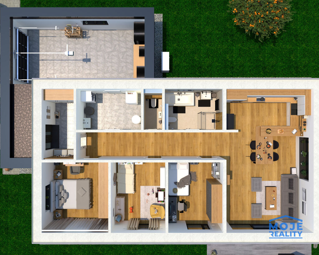 Tento moderní bungalov je ideální volbou pro rodinu, která hledá klid, soukromí a pohodlné bydlení v dosahu přírody i města. Rozlehlá zahrada nabízí široké možnosti využití – od relaxační zóny přes dětské hřiště až po prostor pro zahradničení nebo bazén.