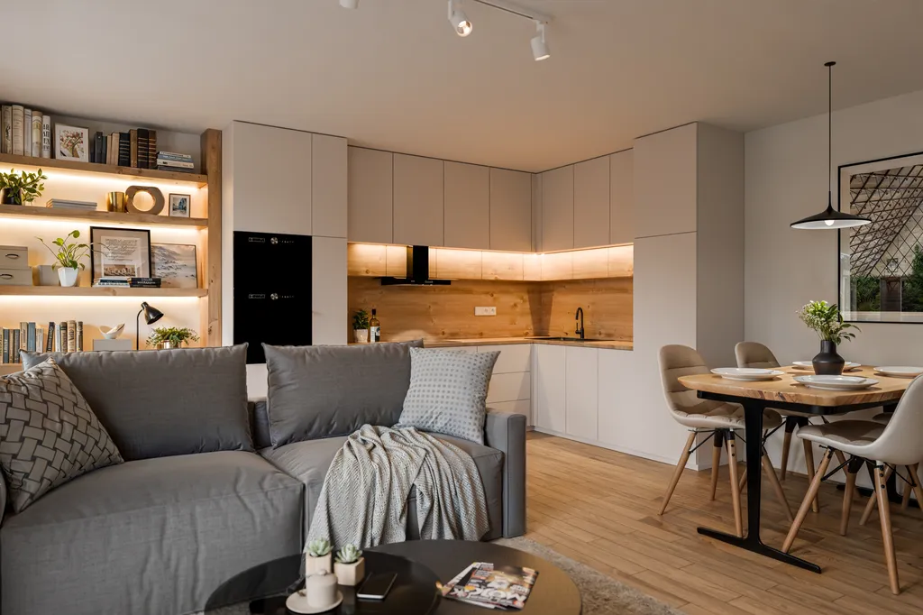 Bytové jednotky s dispozicí 1+kk nabídnou čisté užitné plochy od 33 m2 až do 41 m2 (plochy bez balkonů a sklepů). Interiér je navržen s důrazem na světlost, praktičnost a celkový komfort bydlení. Mimo sklepní kóji má každý byt navíc lodžii, balkon nebo terasu od výměr 3 m2 do 9 m2. K bytům je možné dokoupit vlastní parkovací místo ať už v garáži, či venku.
