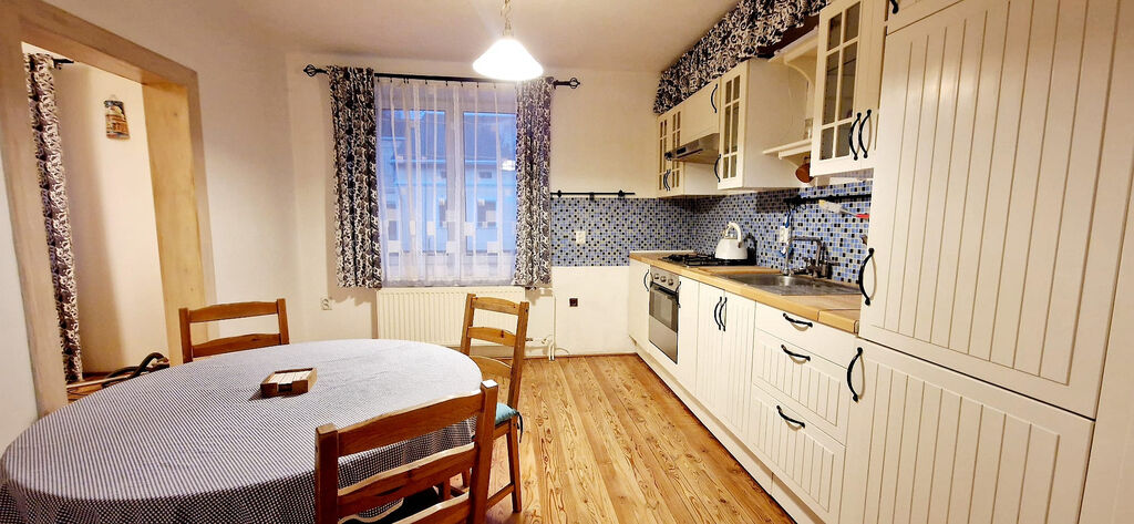 Disponuje předsíni, obývacím pokojem, prostornou kuchyní s kuchyňskou linkou se zabudovanými spotřebiči.