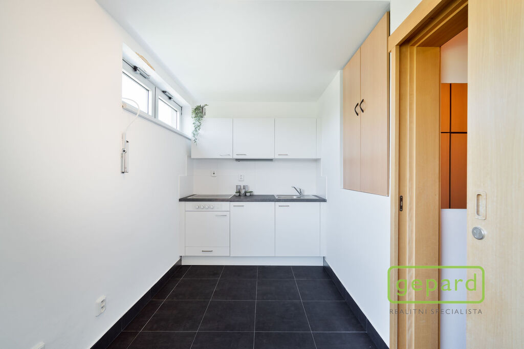 Při vstupu do bytu se ocitneme v chodbě, kde se nachází velká vestavěná skříň. Z chodby lze pokračovat do koupelny se sprchovým koutem nebo do obývací části, kde se nachází kuchyňská linka s varnou deskou a obývací pokoj se vstupem na balkon o velikosti 5,1 m2 s krásným výhledem do parku Vítkov. Byt není vybaven nábytkem.