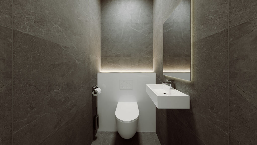 • Luxusně zařízená koupelna dle vizualizací (vana, sprchový kout, podomítkové baterie, dvojité umyvadlo, osvětlené zrcadlo, topný žebřík, nika)