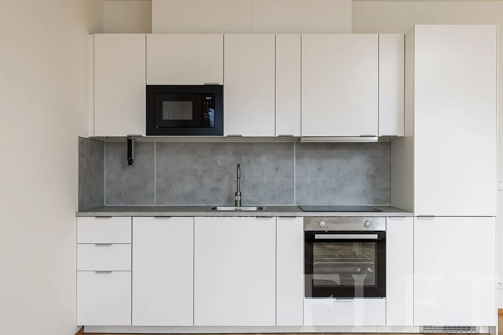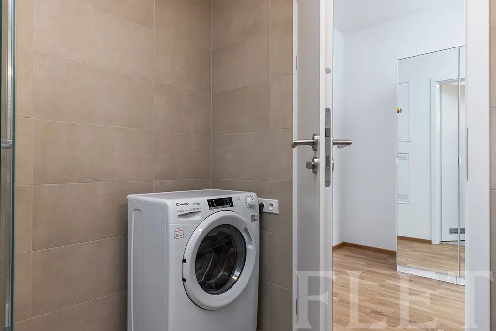 Byt je vybaven plně zařízenou kuchyňskou linkou – k dispozici je lednice, trouba, myčka i digestoř, samozřejmostí je také pračka.