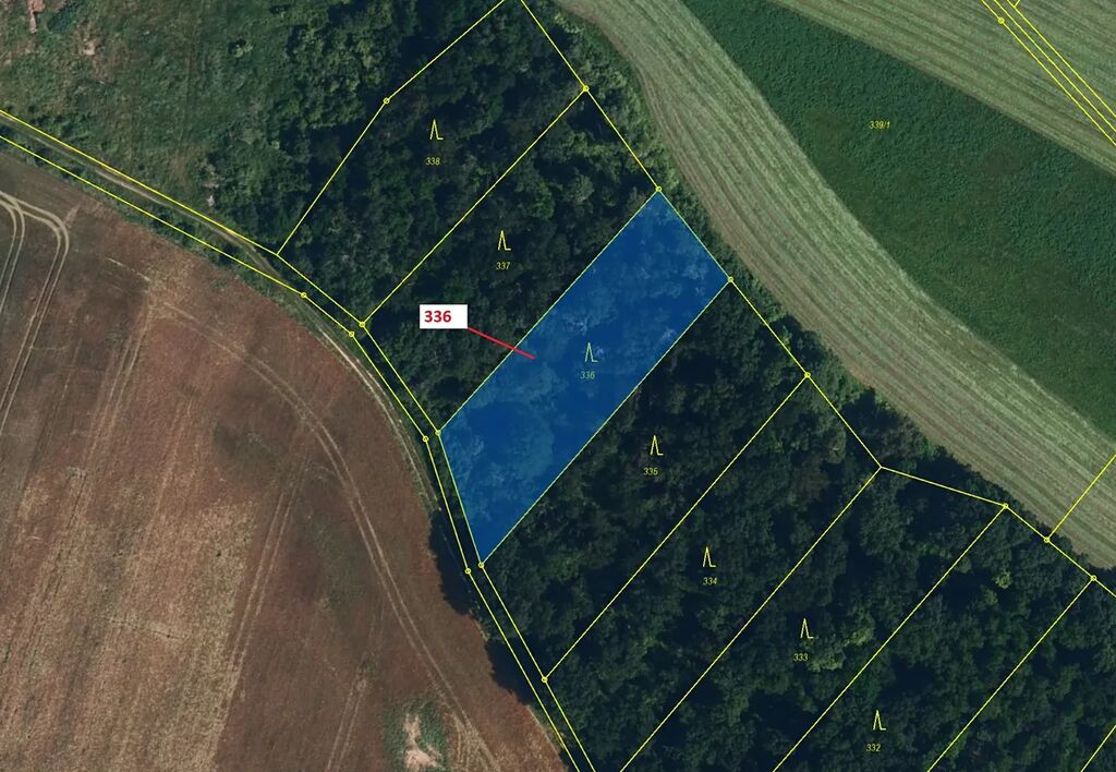 Lesní pozemek o výměře 1947 m2, parcelní číslo 336, podíl 1/1, katastrální území Přešovice, obec Přešovice, obec s rozšířenou působností Třebíč, okres Třebíč, Kraj Vysočina. Po těžbě.