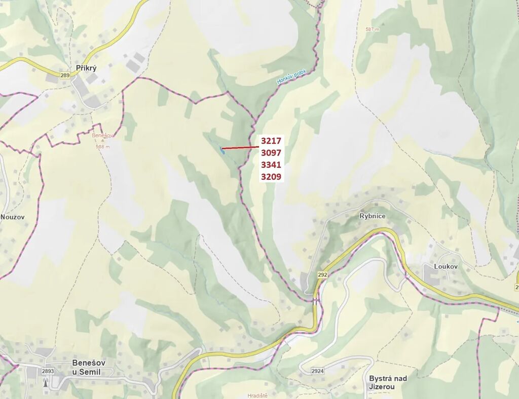 Lesní pozemky a vodní plocha o výměře 1649 m2, parcelní čísla 3217, 3097, 3341, 3209, podíl 1/1, katastrální území Benešov u Semil, obec Benešov u Semil, obec s rozšířenou působností Semily, okres Semily, Liberecký kraj.