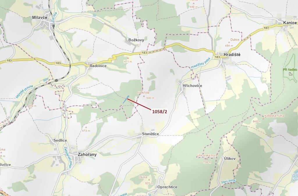Lesní pozemek o výměře 5 152 m2, parcelní číslo 1058/2, podíl 1/1, katastrální území Radonice u Milavčí, obec Milavče, obec s rozšířenou působností Domažlice, okres Domažlice, Plzeňský kraj. Po těžbě.