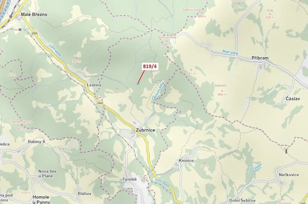 Lesní pozemek o výměře 2 875 m2, parcelní číslo 819/4, podíl 9/10, katastrální území Zubrnice, obec Zubrnice, obec s rozšířenou působností Ústí nad Labem, okres Ústí nad Labem, Ústecký kraj. Po těžbě.