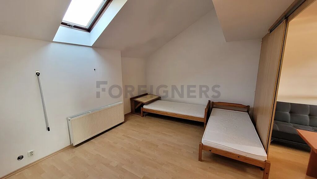 Druhá ložnice, rovněž vybavená dvěma jednolůžky, může sloužit jako druhá ložnice pro studenty sdílející byt nebo jako pracovna.