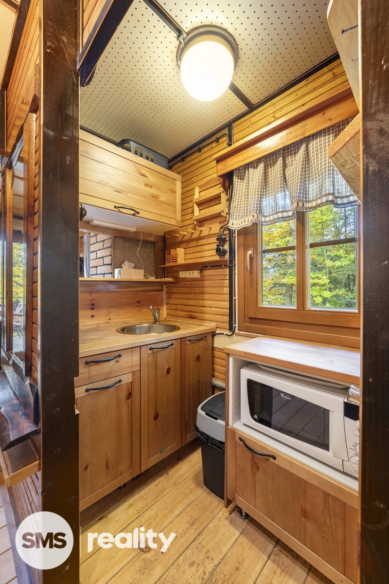 Chatka a vybavení: Chatička prošla rekonstrukcí a je napojena na obecní vodovod i kanalizaci.