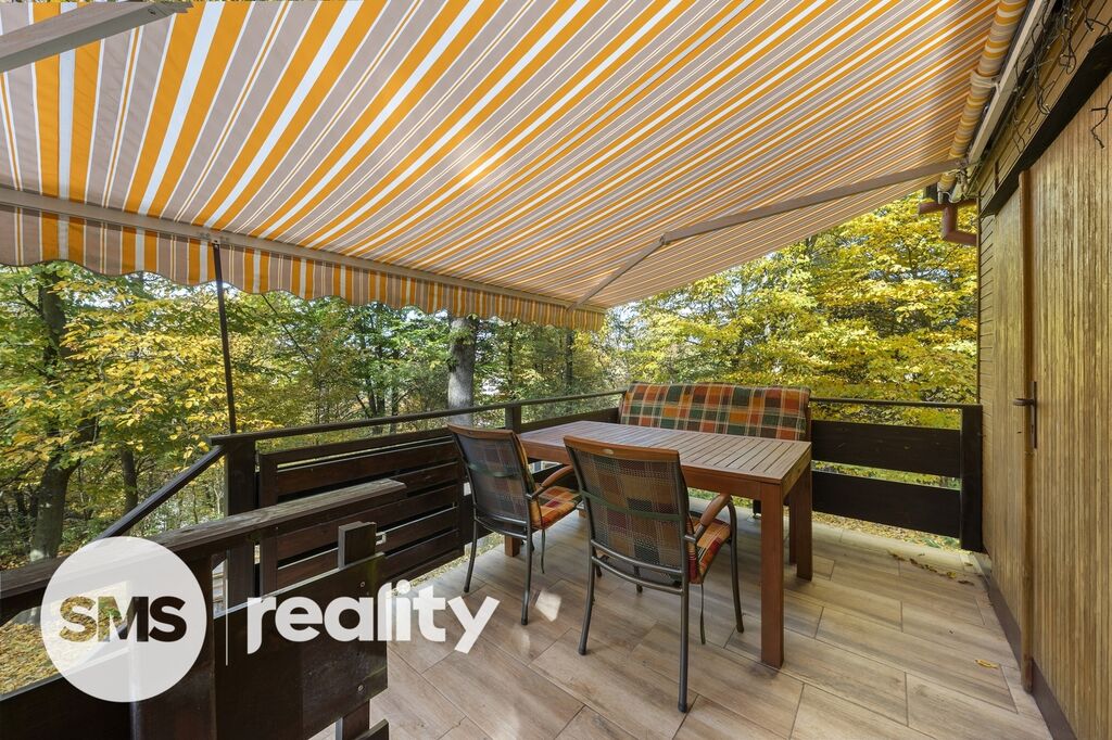 Z obývací části je přímý vstup na terasu, která je oplocená a vybavena výsuvnou markýzou – ideální pro posezení, grilování či letní relaxaci.