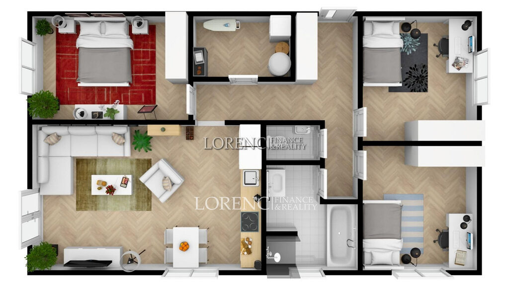 Dům má užitnou plochu 90 m² a dispozici 4+kk – prostorný obývací pokoj s kuchyní (28 m²), tři ložnice (13,6 m², 12 m², 12 m²), technickou místnost, koupelnu se sprchovým koutem a samostatné WC. Podlahové vytápění v hlavních místnostech doplňují úsporné topné panely.