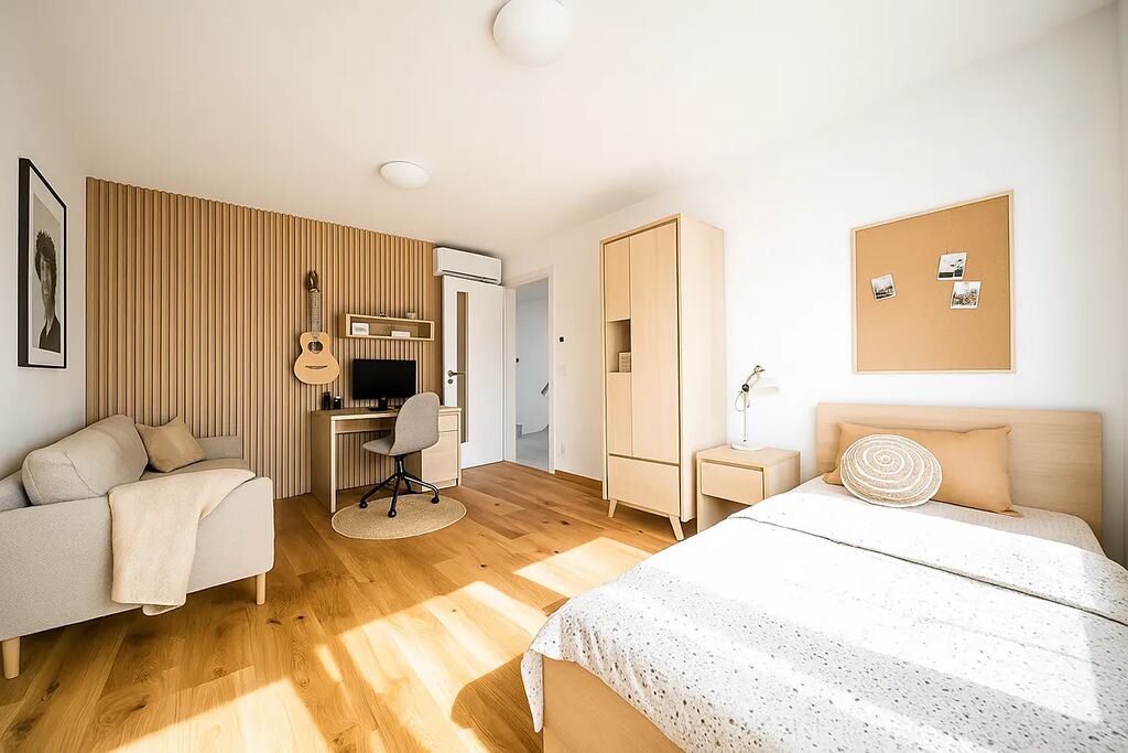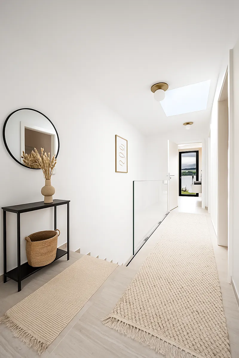 Součástí kupní ceny jsou navíc již připravené rozvody pro napojení klimatizace a osazení fotovoltaických panelů na střechu, venkovní žaluzie na všechna okna na elektrické ovládání či skleněné zábradlí na schodišti.