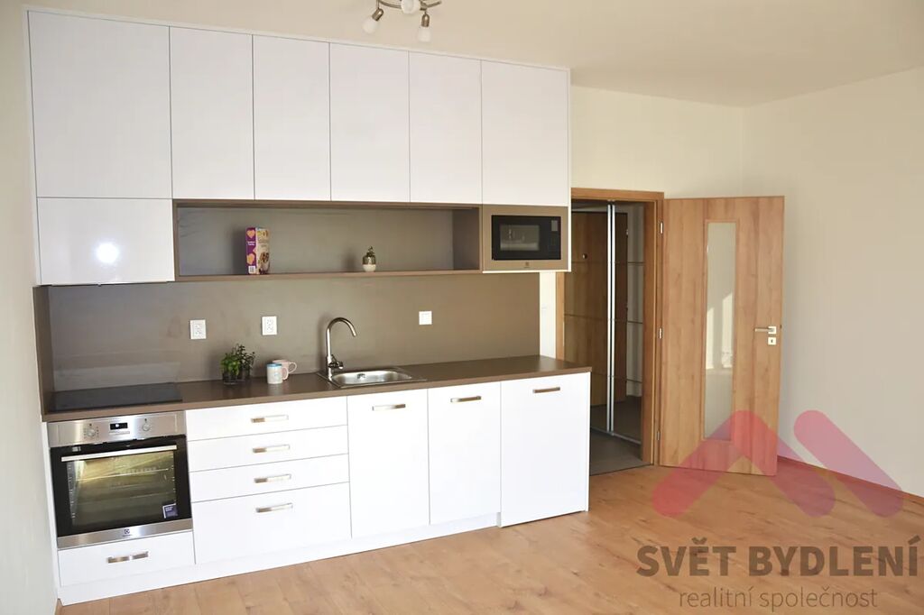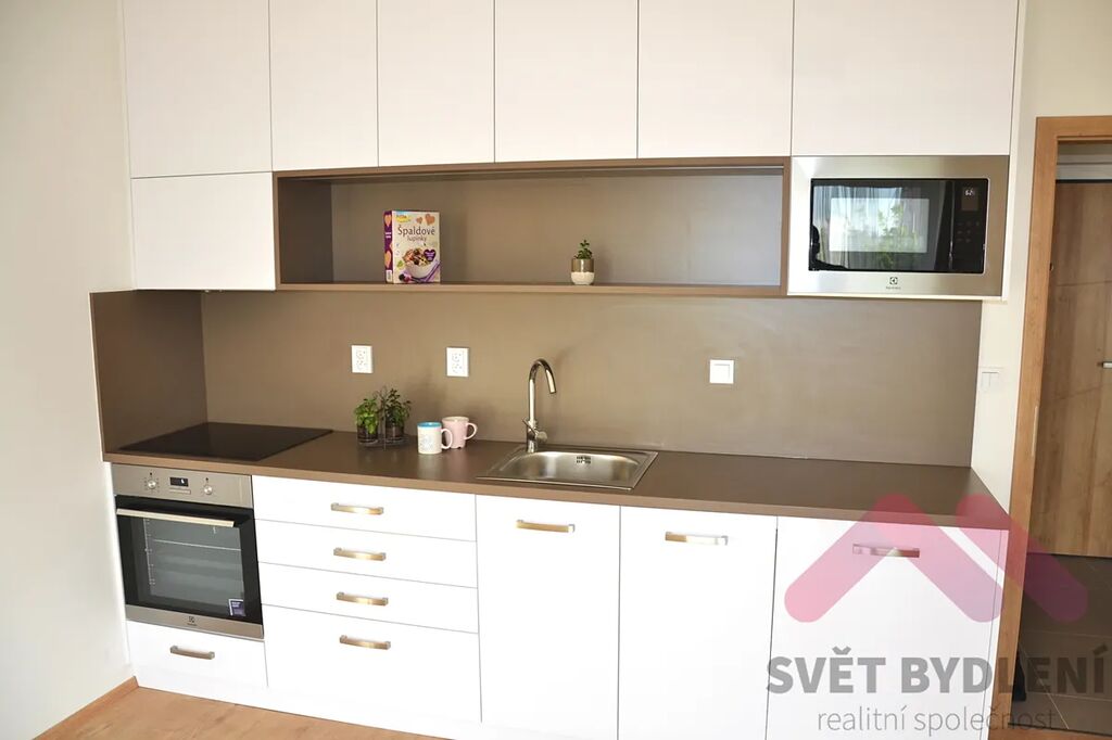 Byt je vybaven kuchyňskou linkou s vestavnou troubou, sklokeramickou varnou deskou, digestoří, chladničkou a mikrovlnnou troubou.