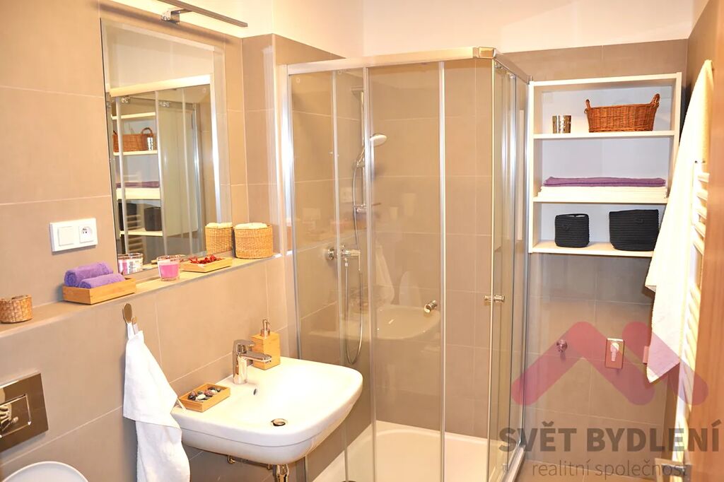 Koupelna se sprchovým koutem a toaletou. Vše je zánovní a ve výborném stavu.