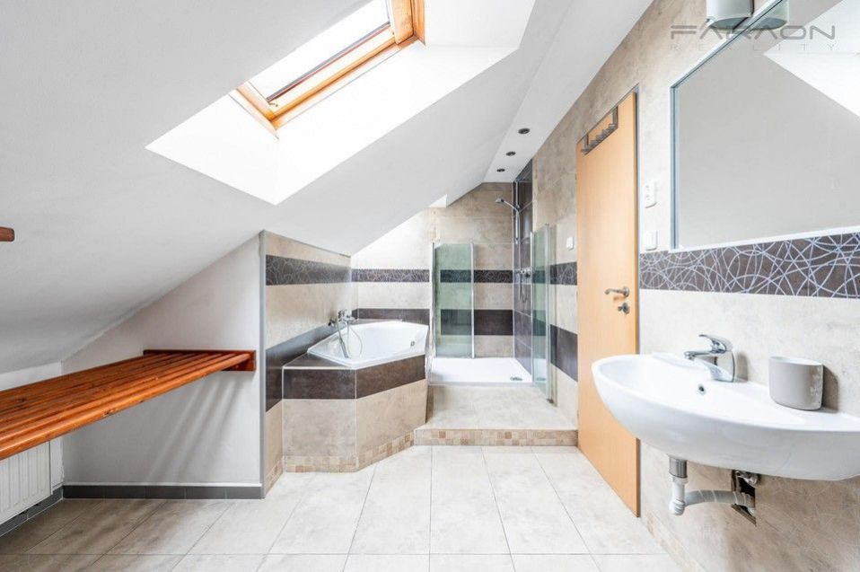 Byt se pronajímá zařízený, viz. foto. Kuchyně je vybavena nádobím a všemi spotřebiči - myčka, sklokeramická deska, trouba, digestoř, lednice. V ložnici je manželská postel, druhý pokoj může sloužit jako ložnice, šatna či pracovna. V bytě je dostatek úložných prostor. Nábytek vyrobený na zakázku, z masivu exotického dřeva, vhodně dotváří atmosféru přiznaných tesaných trámů v interiéru, s dřevěným schodištěm.