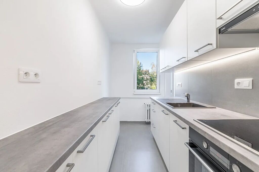 Byt prošel kompletní rekonstrukcí – nová kuchyňská linka, podlahy, koupelna i rozvody. Dispozici tvoří prostorný obývací pokoj, samostatná ložnice, kuchyně s jídelním koutem, koupelna se sprchovým koutem a samostatné WC. K bytu náleží také sklepní kóje.