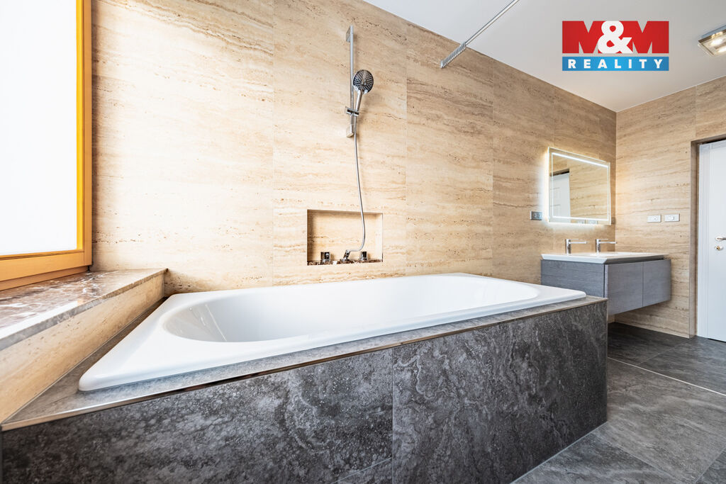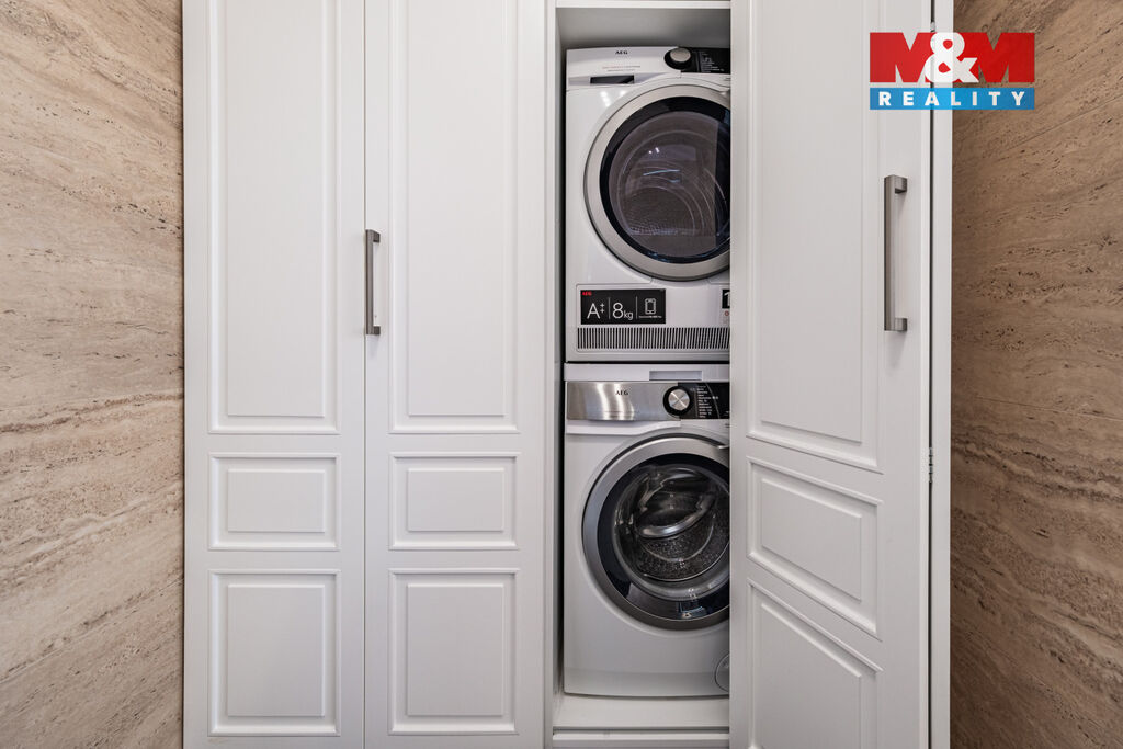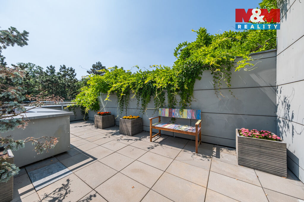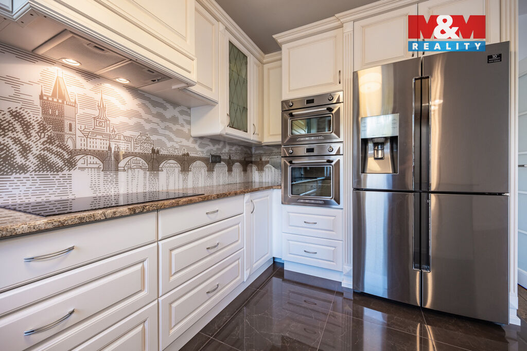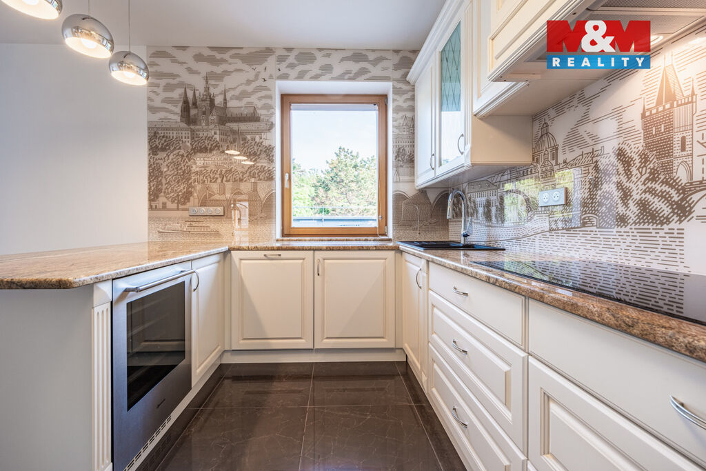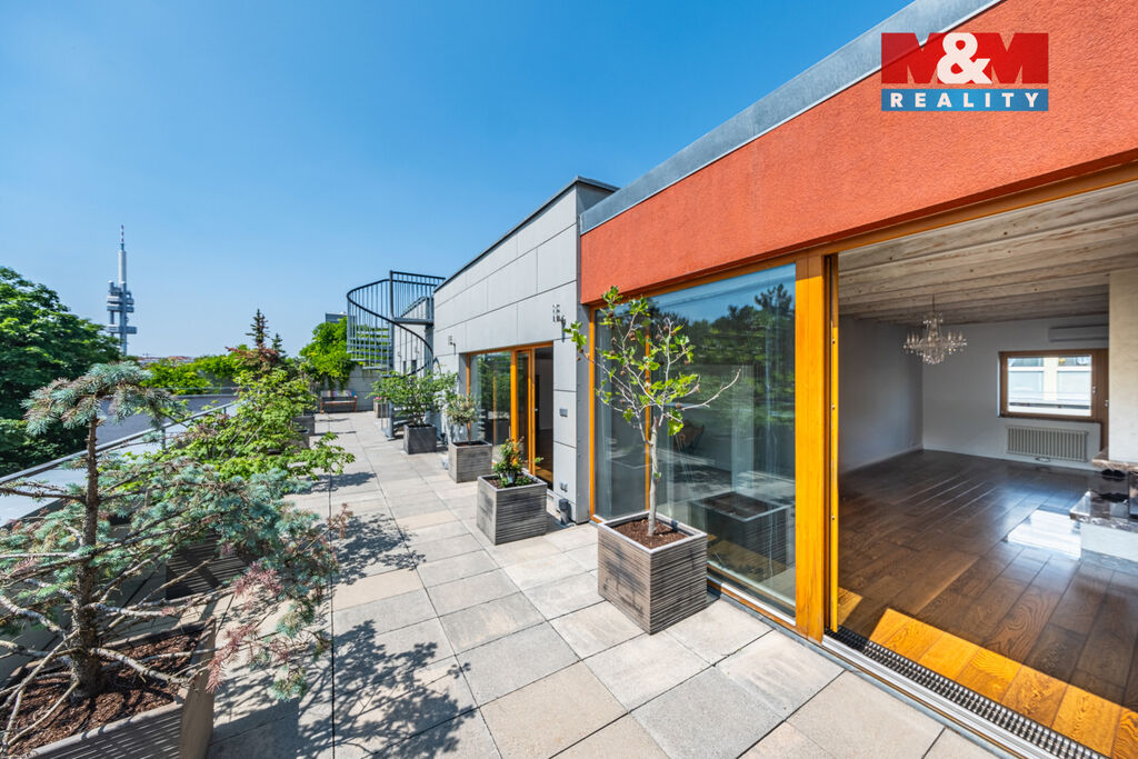 V prestižní lokalitě v samém srdci Prahy nabízíme unikátní byt o dispozici 5+kk o podlahové ploše 175,8 m² se dvěma slunnými terasami v 6. NP 63,9 m² a v 7. NP 132,1 m² s dechberoucím výhledem na Prahu, severní balkón 8 m² a navíc prostorný sklep o velikosti 13,2 m². Interiér nabízí prostornou vstupní chodbu s vestavěnými skříněmi a samostatnou šatnou, tři ložnice, dvě koupelny s kamennou podlahou s podlahovým vytápěním, značkovým sociálním zařízením Villeroy&Boch s hudebním systémem. Dominantou bytu je velkorysý obývací pokoj se zvýšeným stropem, kroy a krbem, prostorná jídelní místnost, kuchyňský kout s podlahovým vytápěním, s vestavěnými spotřebiči luxusní zn. SMEG, americkou chladničkou a vinotékou. Dalšími nadstandardními prvky jsou dubové odhlučněné podlahy, knihovna s LED osvětlením, klimatizace Toshiba v každém pokoji, odhlučněné stěny. Možné přikoupit garážové stání + 1mil. Kč. Byt nabízí naprosté soukromí, špičkový komfort a výjimečný výhled na celou Prahu.
