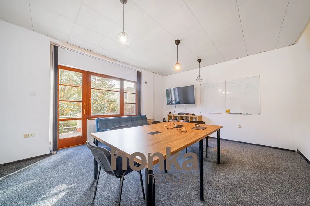 Tři kanceláře, čajová kuchyňka, vstupní hala a WC. Jedna kancelář má přístup na terasu a zahradu.