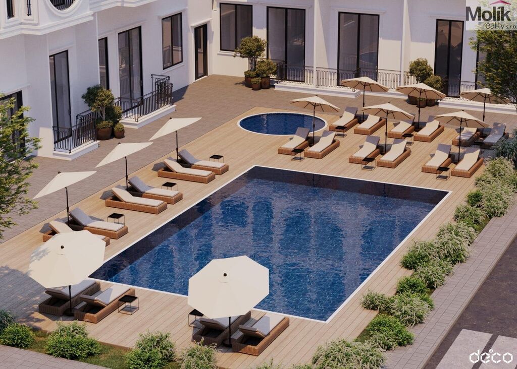 Zázemí resortu: možnost využití služeb (bazén, restaurace, správa pronájmu)