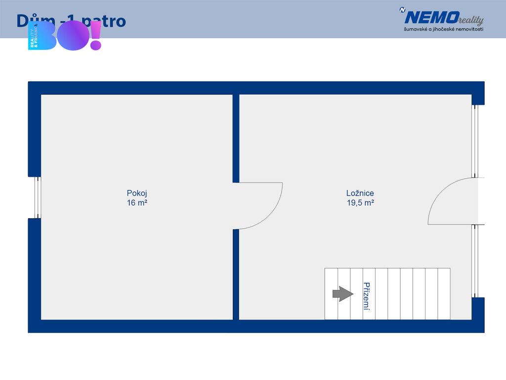 Ve 2.NP prostorná ložnice 19,5 m² a pokoj 16 m².