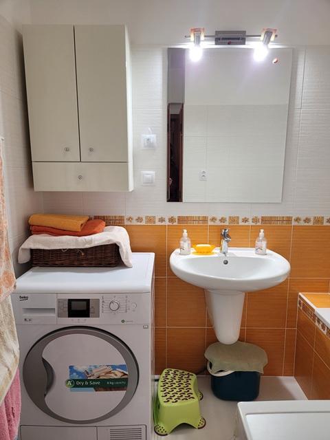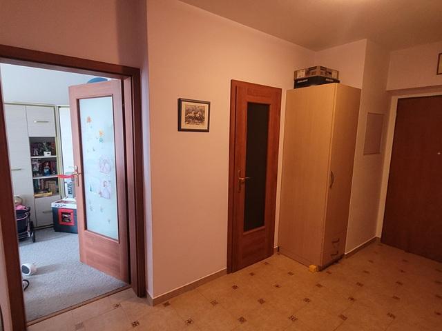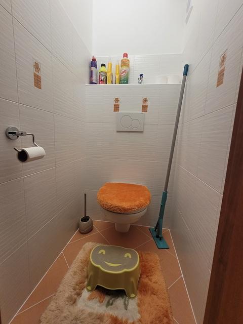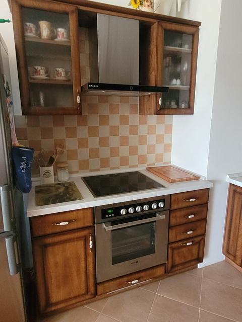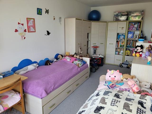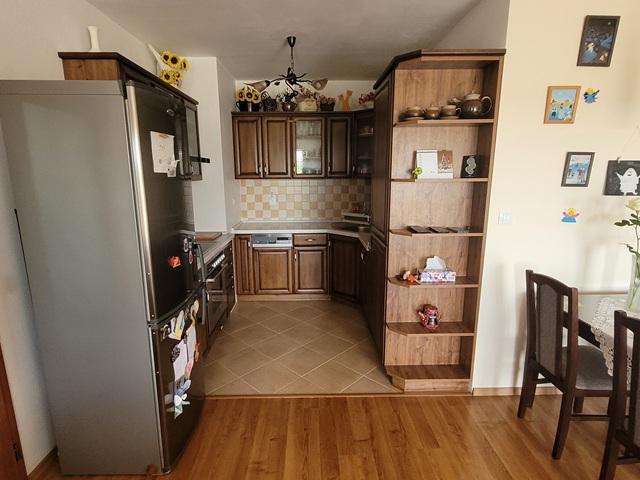V kuchyňském koutu se nachází kuchyňská linka ve tvaru písmene U, vybavena vestavěnými spotřebiči. Okna v bytě jsou dřevěná - euro profily, opatřená venkovními roletami. Vytápění je dálkové, kalorimetr je osazen v bytě. Podlahy v chodbě, koupelně, WC a v kuchyňském koutu jsou kryté keramickou dlažbou, v obývacím pokoji a ložnici je plovoucí podlaha, v dětském pokoji je koberec. V koupelně jsou keramické obklady a dlažba, vana, umývadlo, přípojka na pračku, WC je samostatné, rovněž s keramickými obklady a dlažbou.