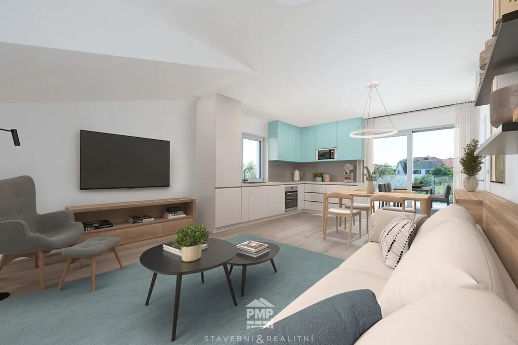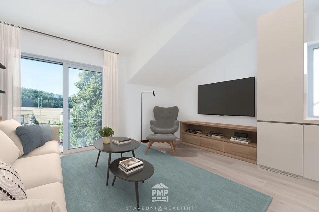 Dispozice bytu zahrnuje světlý obývací pokoj s kuchyňským koutem a vstupem na terasu, dvě ložnice, koupelnu vybavenou velkoformátovým obkladem a sprchovým koutem typu walk-in, samostatné WC a praktickou šatnu. Podkrovní atmosféru doplňují velká střešní okna, která zajišťují dostatek denního světla.
