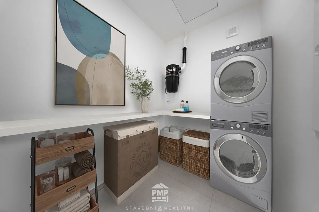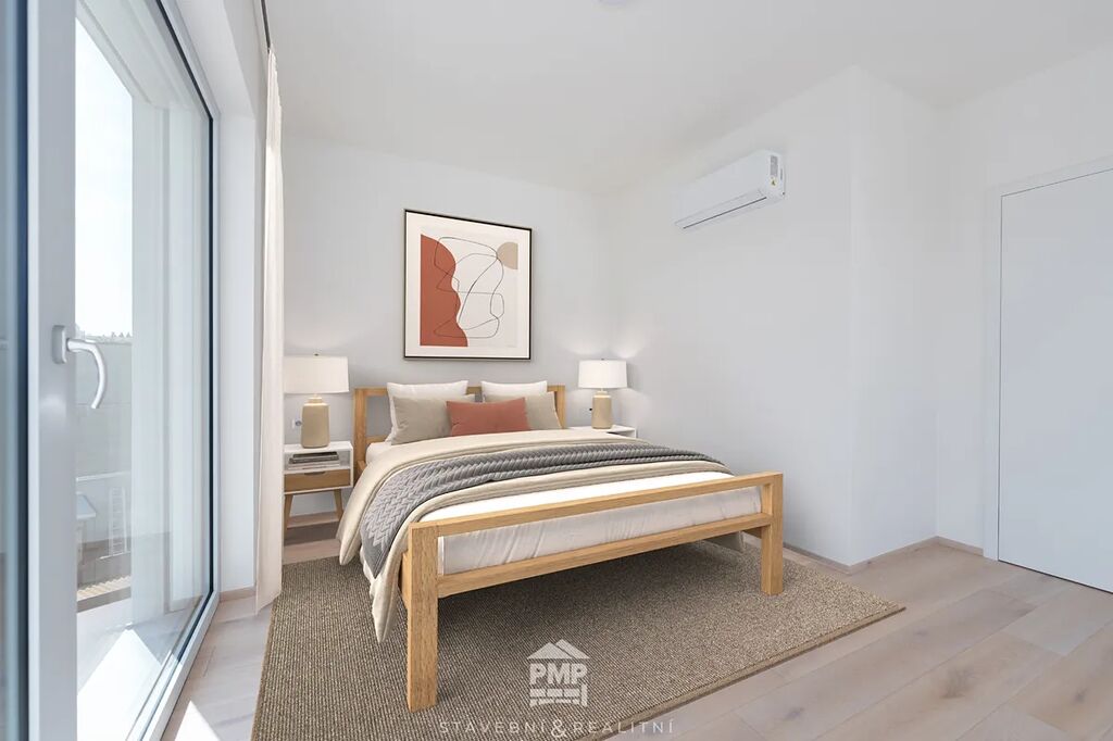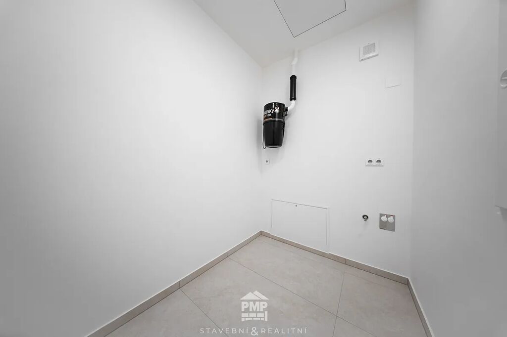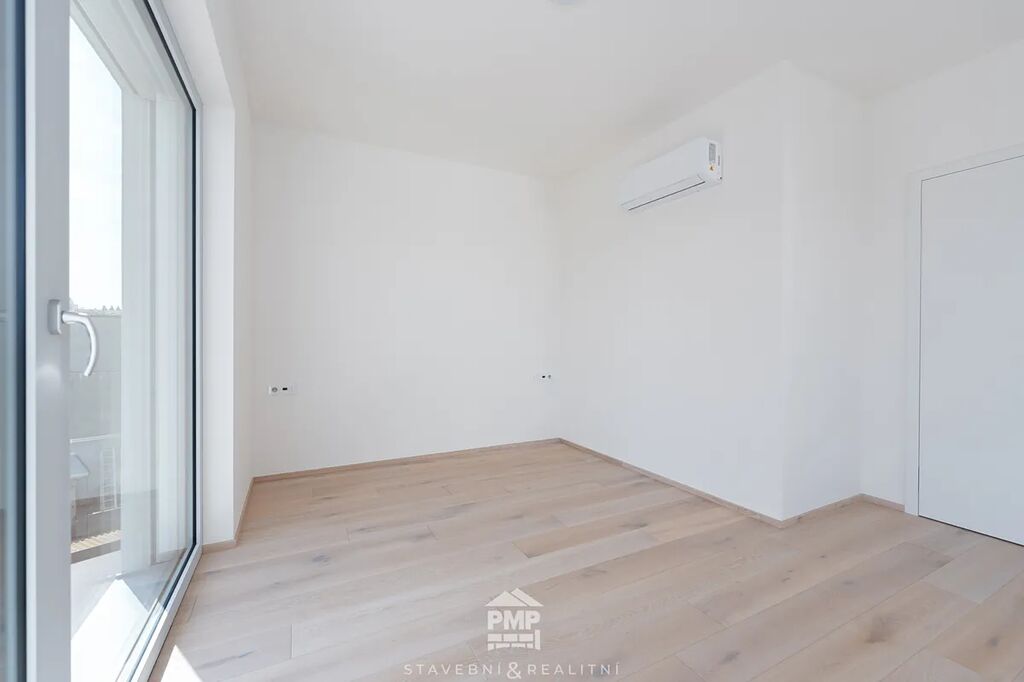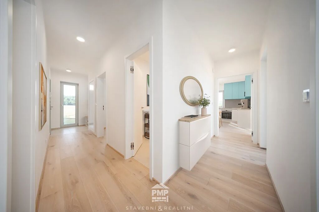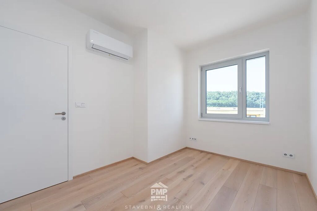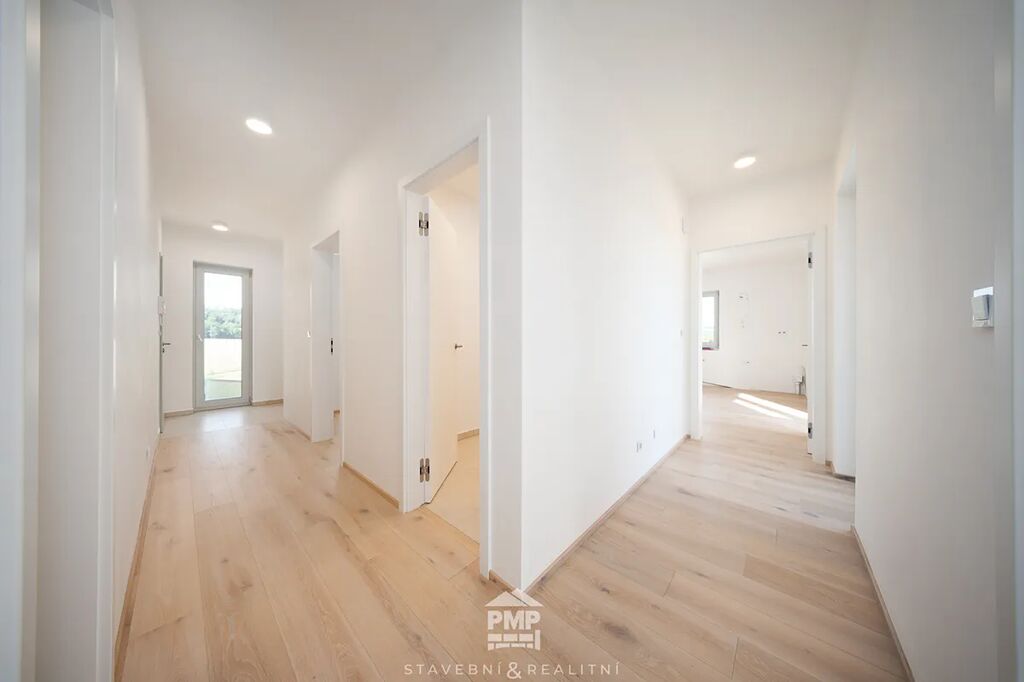 Byt je vybaven klimatizací v každé obytné místnosti, která zajistí příjemné prostředí i v horkých letních dnech. O vytápění a ohřev vody se stará centrální tepelné čerpadlo NIBE vzduch–voda, které je napojeno na podlahové teplovodní vytápění. Moderní standard doplňují dubové lepené podlahy, hliníková okna s izolačním trojsklem a venkovní žaluzie na elektrický pohon. Samozřejmostí je centrální vysavač, příprava na fotovoltaickou elektrárnu a využívání dešťové vody, stejně jako garáž s přípojkou pro wallbox a příprava na optický internet. Tento byt tak nabízí nejen útulné bydlení, ale i technickou připravenost pro budoucnost.