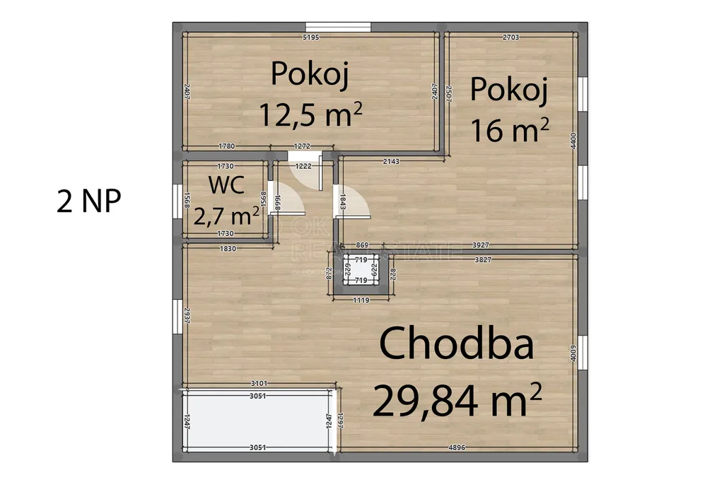 1. NP: 2× pokoj ▪ chodba ▪ WC