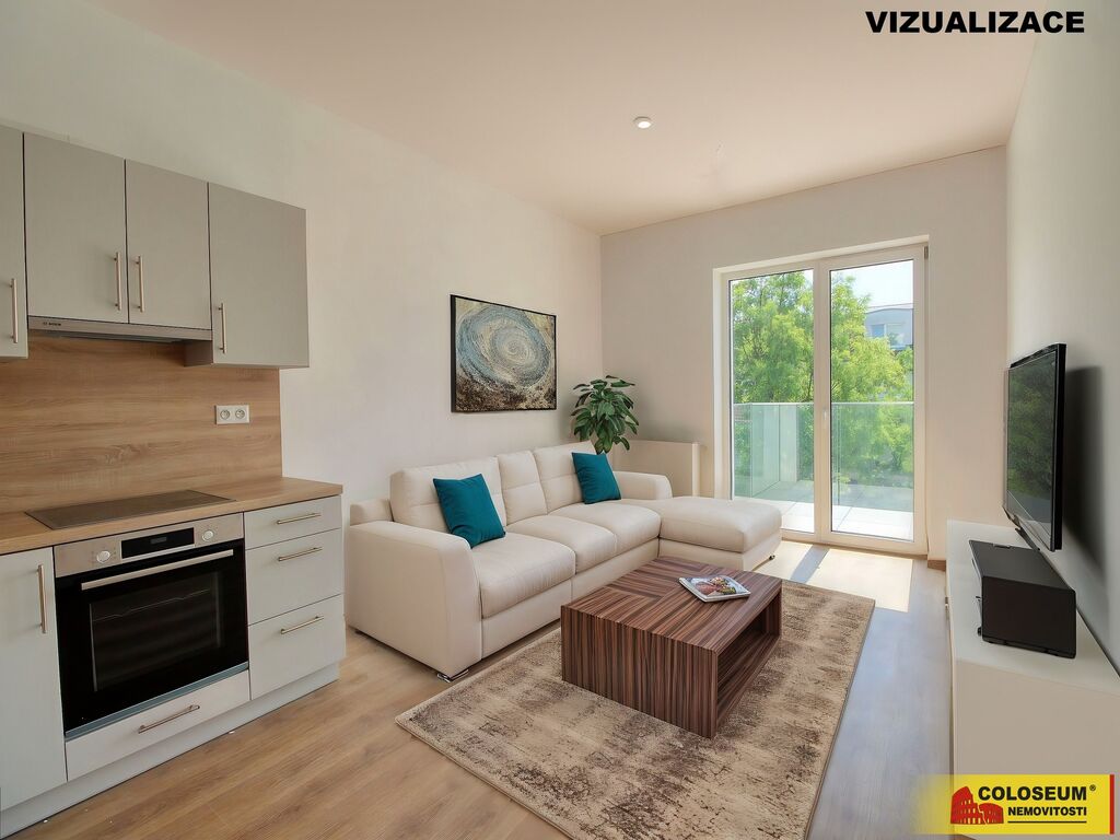 Byt se skládá z obývacího pokoje s kuchyňským koutem, ložnice, koupelny s toaletou, předsíně, komory a balkonu. Byt se pronajímá nevybavený, je osazen novou kuchyňskou linkou, sklokeramickou varnou deskou, troubou a lednicí. K bytu je možné pronajmou parkovací stání v podzemní garáži, vlastní venkovní stání a sklepní kóji. Pro lepší představu možného budoucího stavu přikládáme vizualizace obývacího pokoje a ložnice.