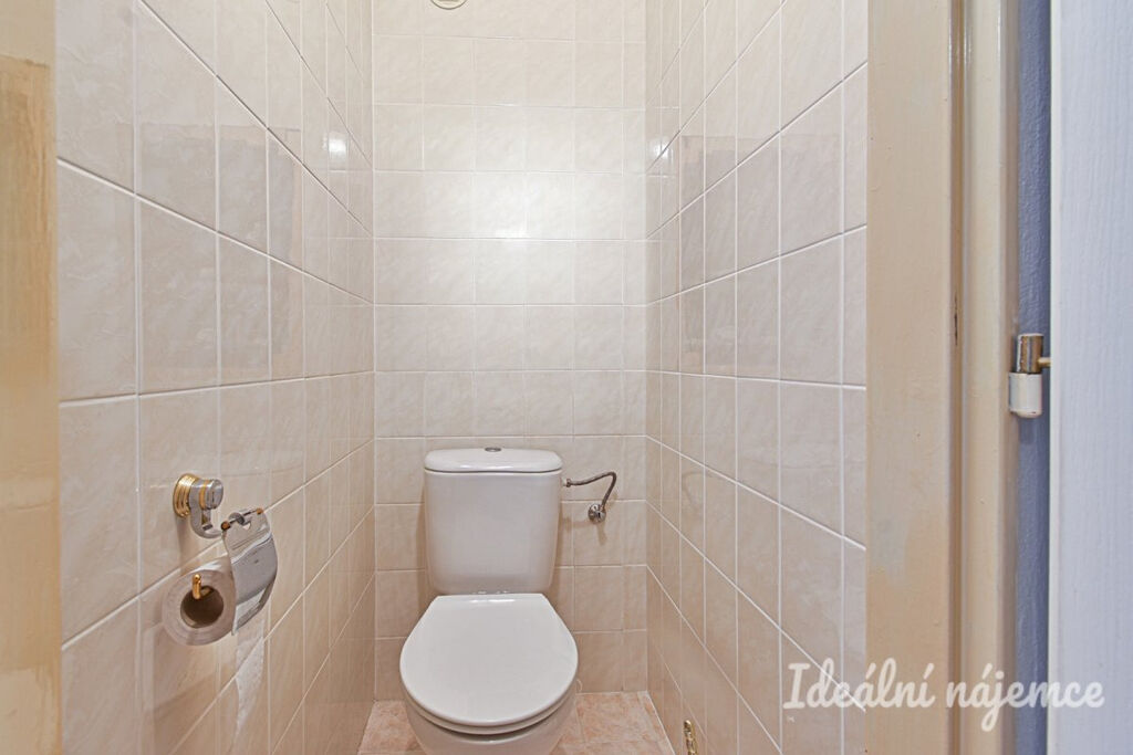 Koupelna disponuje vanou a umyvadlem. Toaleta je oddělena.