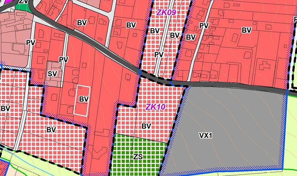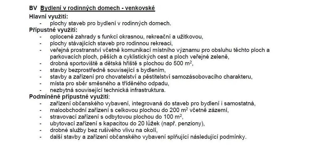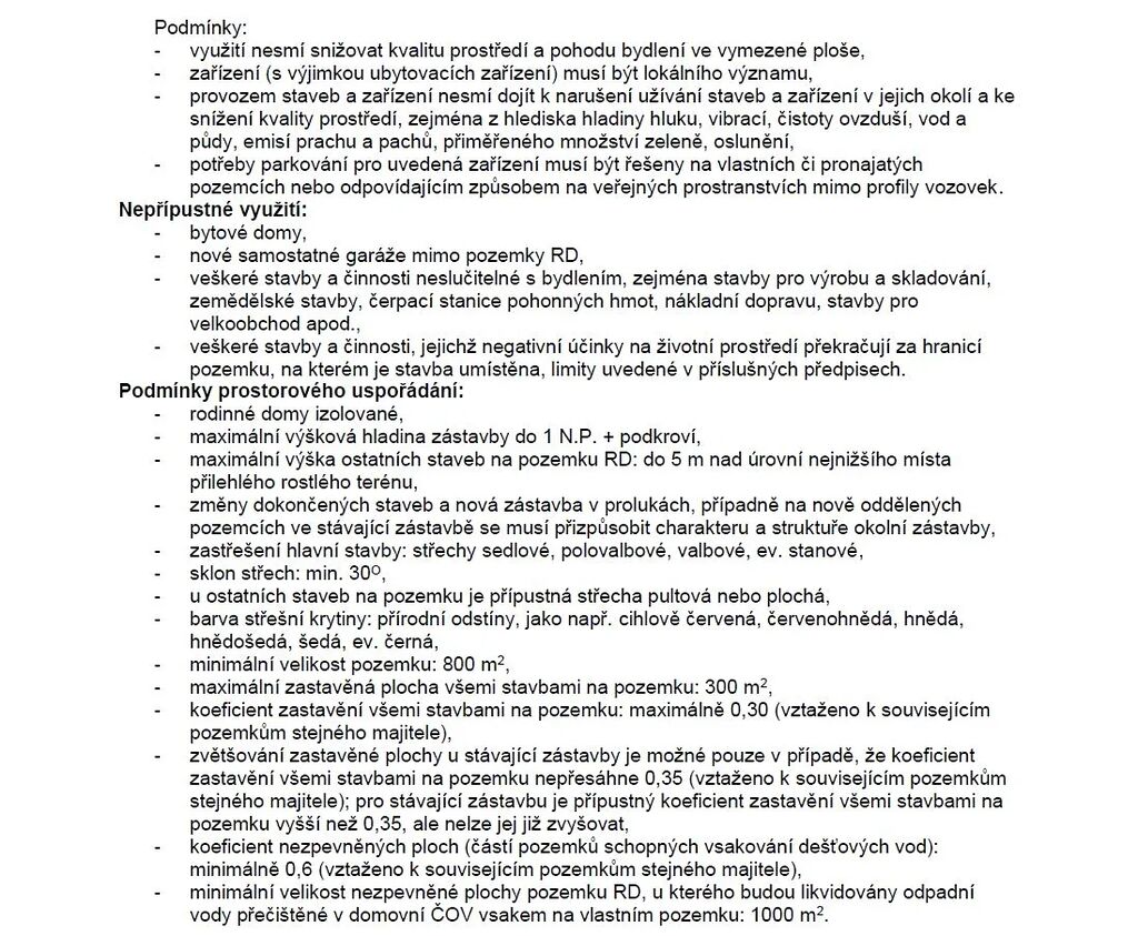 Dle územního plánu se pozemek nalézá v území BV – bydlení v rodinných domech – venkovské. Podmínky prostorového uspořádání – rodinné domy, minimální velikost pozemku 800 m2, maximální zastavěná plocha 300 m2, koeficient zastavění 30%, u pozemku větším než 1.000 m2 lze likvidovat odpadní vody přes ČOV vsakem.