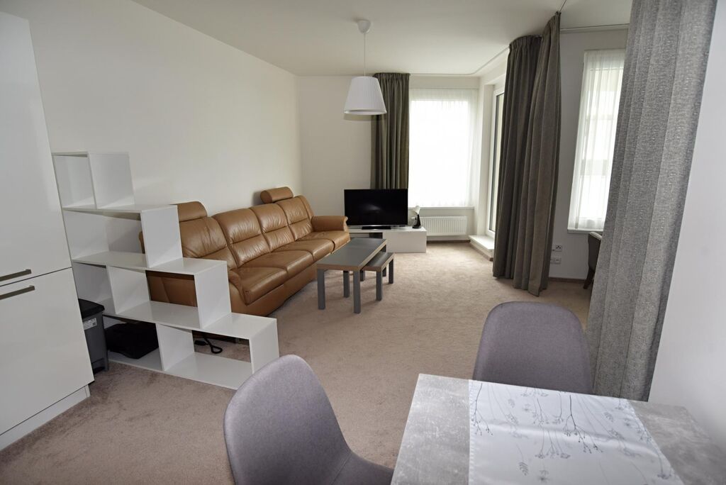 Samotný byt má 57 m, doplněných o balkon o velikosti 6 m s východní orientací, který poskytuje příjemný výhled do zeleně a okolní zástavby. Byt je kompletně vybavený a připravený k okamžitému nastěhování. Nachází se zde elegantní kuchyňská linka na míru se zabudovanými spotřebiči (lednice s mrazákem, varná deska, trouba a myčka nádobí), útulný obývací prostor s přímým vstupem na balkon, ložnice funkčně propojená s obytnou částí a prostorná vstupní chodba.