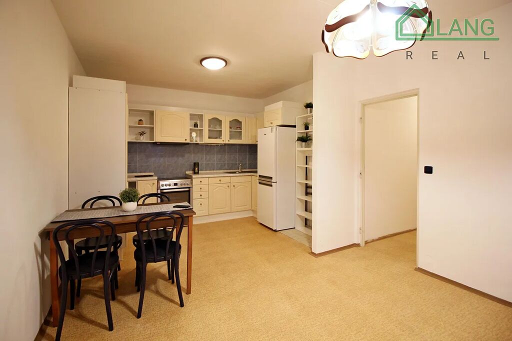 Byt disponuje prostornou kuchyní vybavenou sporákem, lednicí, digestoří a jídelním stolem, přičemž zbytek prostoru je možné využít jako obývací část.