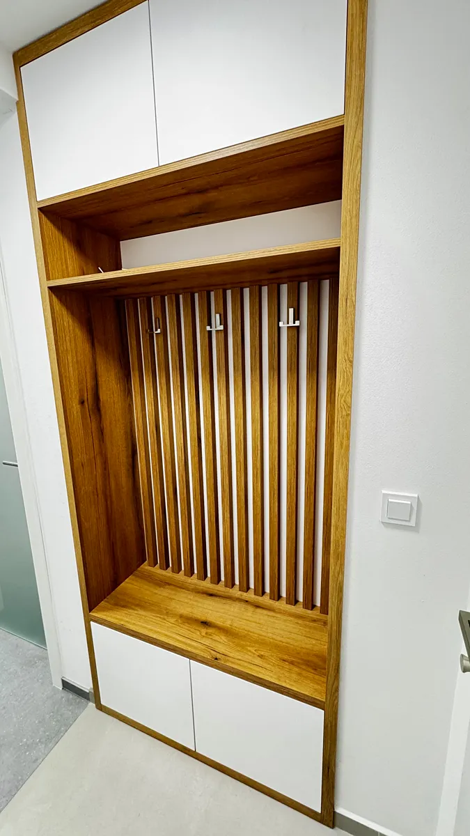 V předsíni je vestavěná skříň a předsíňová stěna. V koupelně je vestavěná stěna s pračkou, sušičkou a úložným prostorem.