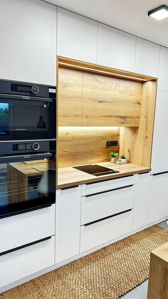 Kuchyně a jídelní kout na míru. Jídelní stůl a židle. Za kuchyní je vybudovaný prostor, který slouží jako pracovna.
