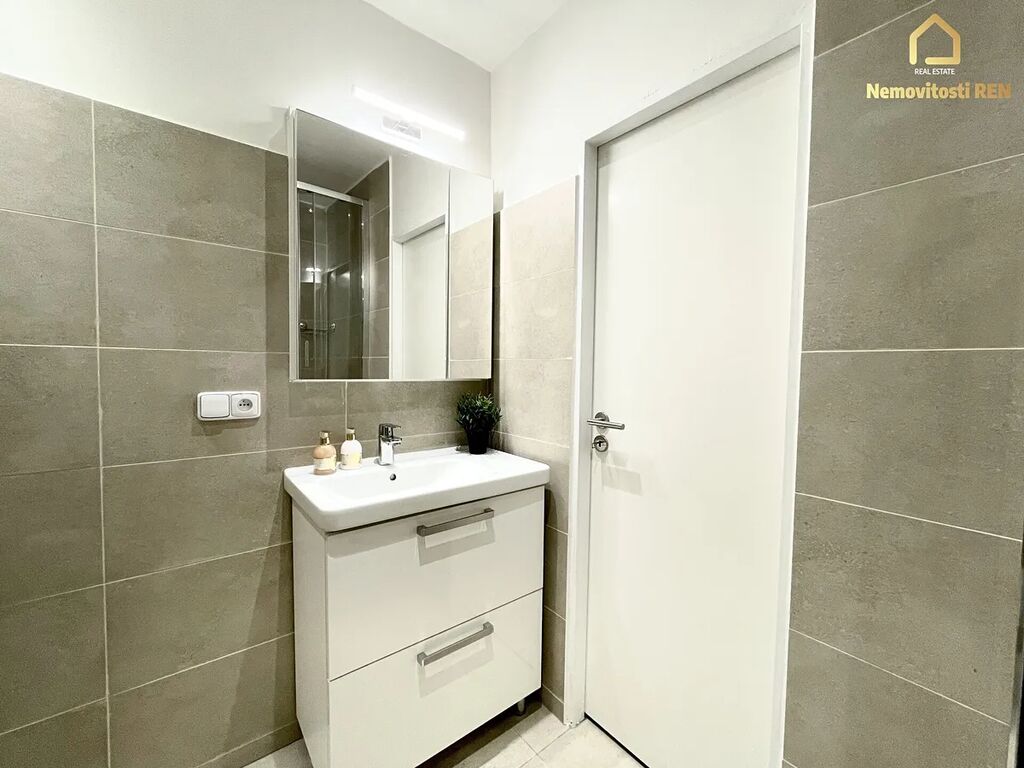 Koupelna je propojena s WC, vybavena sprchovým koutem, umyvadlem, toaletou a prostorem pro pračku.