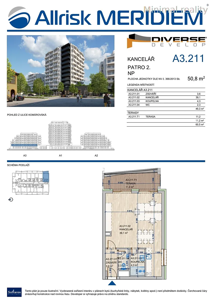 Nabízíme k pronájmu novostavbu kanceláře o dispozic 1+kk o velikosti 50 m², s prostornou terasou 11 m², nacházející se ve 2.NP v prestižním projektu Allrisk MERIDIEM v Komárově na ulici Komárovská.