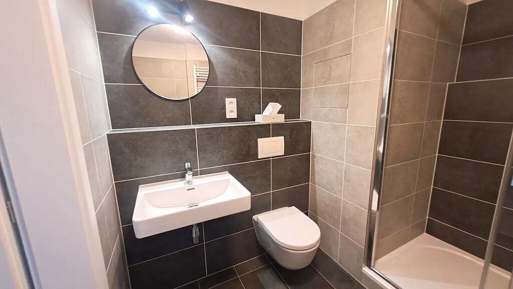 Koupelna a WC jsou společné (5m2), k dispozici je velký sprchový kout, umyvadlo a osvětlené zrcadlo. Najdeme zde i přípravu na připojení pračky a sušičky, což je příjemný bonus.