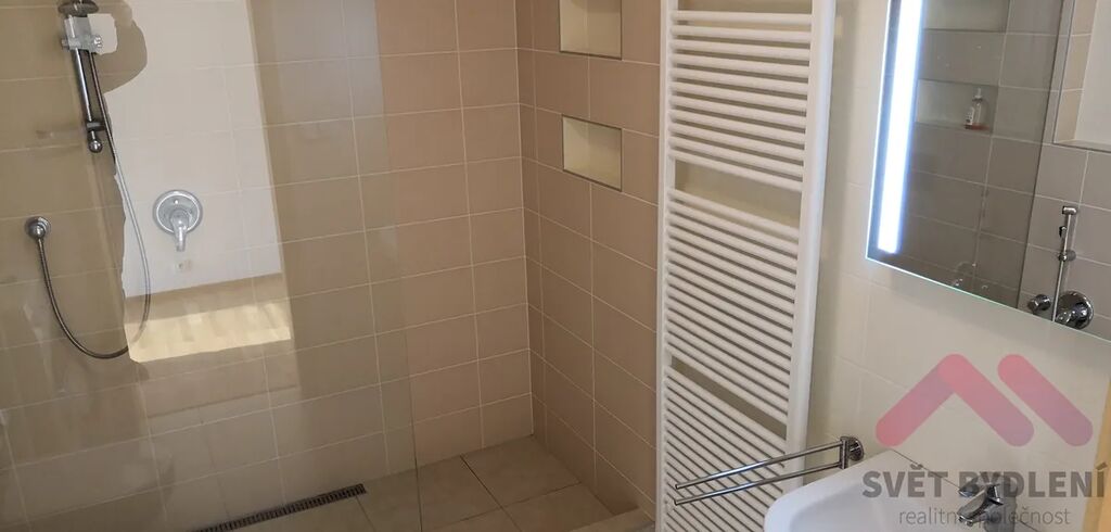 Moderní kuchyňská linka je vybavená spotřebiči, koupelna disponuje prostorným sprchovým koutem a pračkou.
