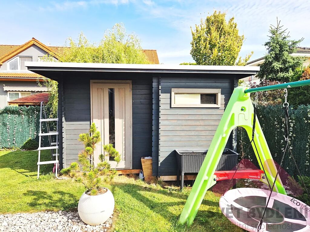 Zimní zahrada s posuvným otevíráním - skvělé místo pro odpočinek, rodinné oslavy nebo posezení s přáteli po celý rok. Velký zahradní domek pro uskladnění nářadí či sportovního vybavení. Zděný nadzemní bazén pro letní osvěžení. Možnost ponechání herních prvků pro děti (houpačky, skluzavky apod.). Parkování pro dvě auta - jedno stání na pozemku a jedno přímo před domem.