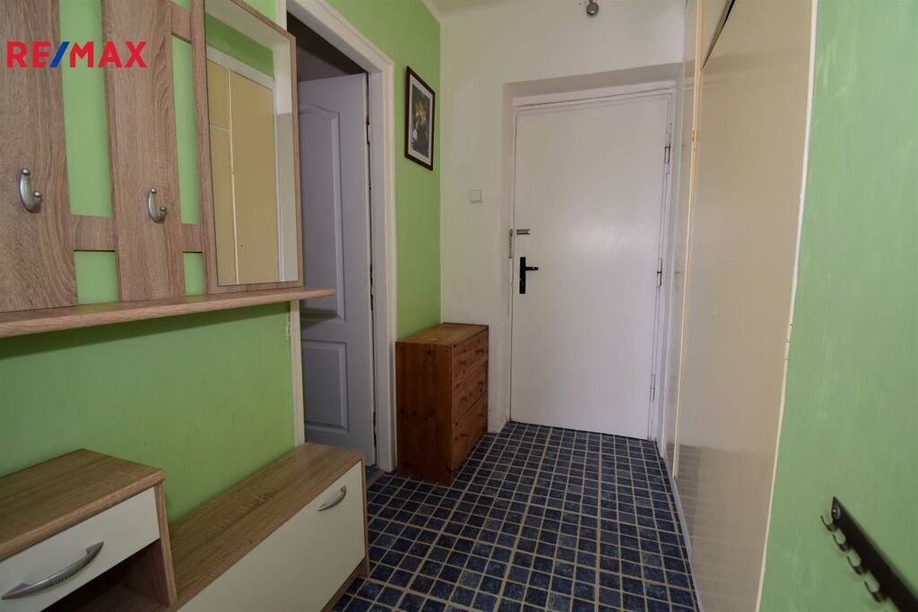 Dispozice bytu: za vchodovými dveřmi je předsíň se zabudovanou skříní vlevo, vpravo je pak vstup do koupelny s vanou a WC, kde je i pračka, bojler a skříňka, dále je vstup do kuchyně s rohovou kuchyňskou linkou, jídelním stolem a velkou lednicí s mrazákem. Z kuchyně je otevřený vstup do obývacího pokoje, kde je sedací souprava a pracovní kout, za obývacím pokojem je prostorná ložnice.