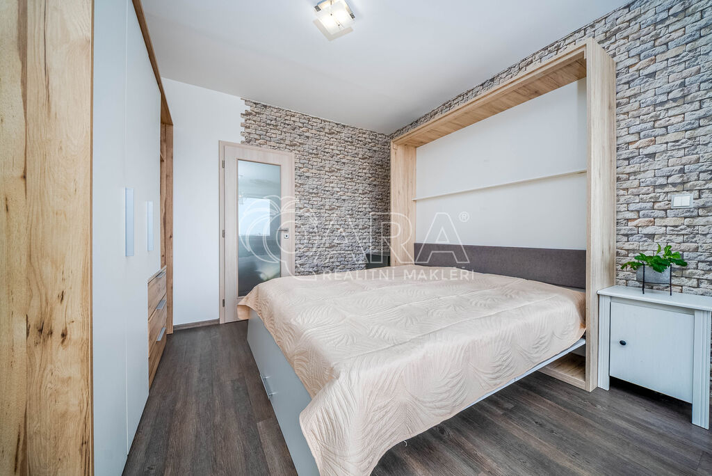 Majitelé efektivně vyřešili prostor hlavního pokoje sklápěcí postelí. Toto řešení Vám umožní mít dostatek místa pro pohyb po bytě a zároveň Vám umožňuje mít v pokoji i pohovku a křeslo.